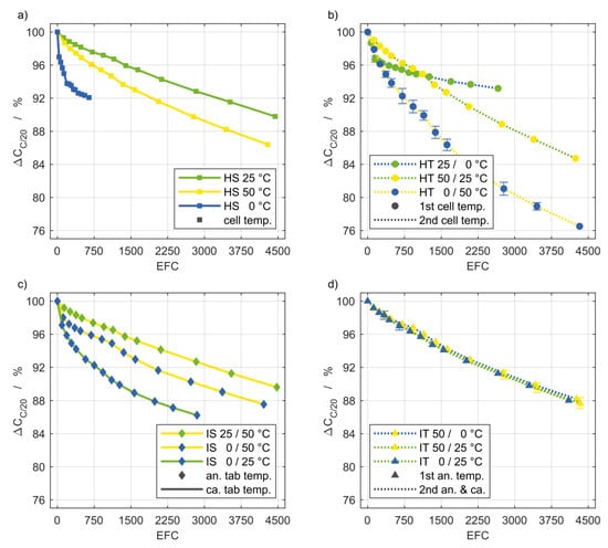 Figure 3 shows the capacity fade for the different setups. The designations in Figure 3a–d correspond to those of the flow diagrams in Figure 1.