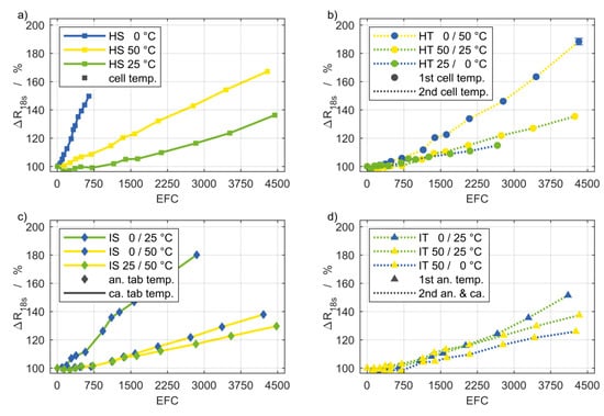 Effects of temperature changes over time are represented in the subfigures (b,d) of Figure 4 and Figure 5 (HT) and (IT). The repeated temperature transients between 0 °C and 50 °C with spatially homogeneous distribution (HT) resulted in the highest polarization and current pulse resistance increase among all setups. Despite the low temperature level of the setup HT 25/0 °C, the according rise of all resistance quantities is surprisingly small. The homogeneous transient boundary conditions are the only circumstance in which the curves of ΔRohm follow the same order relative to one another as in ΔR18s and ΔRpol. These results provide a first indication on a different aging behavior at severe temperature changes and becomes even more apparent in Section 3.4.