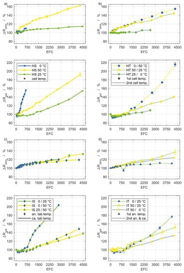 The subfigures (a) in Figure 4 and Figure 5 depicting the homogeneous steady (HS) setups show, as expected, the lowest impedance rise for 25 °C, while the degradation for 50 °C occurs significantly stronger. For 0 °C, the increase of ΔR18s and ΔRpol is even more pronounced, despite less EFC, which is in agreement with the capacity fade. The ohmic resistance in contrast, is not as severely affected by the low temperature condition. Remarkably, the curves of ΔR18s and ΔRpol for HS 25 °C are below 100% through the first 1000 EFC, which indicates that these values decreased in the early stages of cycling. This applies, though less pronounced, to other setups as well and has already been noted by Liu et al. [15].