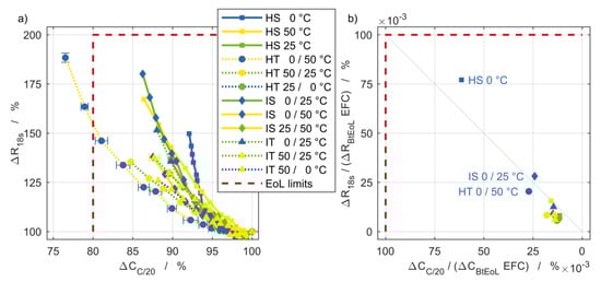 The end of life (EoL) state of high power cells is usually defined as 80% remaining capacity [16] and 100% increase of impedance [17]. In this case, the current pulse resistance is used as impedance quantity since it is regarded to comprise the ohmic and polarization resistance contributions and its time range is most relevant for power applications. The aging results of this study are depicted in Figure 6a as percentage values. The square dashed in red defines the EoL state boundaries while the BoL state appears in the lower right corner. Within this study, the EoL criterion was only exceeded by the setup HT 0/50 °C after 3100 EFC. The individual curves are very densely grouped, so that no significant influence of the different boundary conditions can be seen in this diagram. The capacity fade of the cells of all experimental setups is slightly more pronounced than resistance increase during the first intermediate cell characterizations, while in later cycles the resistance increase dominates. In addition to HT 0/50 °C, the setups HS 0 °C and IS 0/25 °C also differ to some extent from this behavior and show a stronger aging of the resistance compared to the capacity. In Figure 6b the values are normalized to both, EFC and threshold value, which is the difference between the BoL values and the defined EoL and indicated by the index Begin to End of Life (BtEoL). The normalization of both quantities by the threshold values leads to a clear separation of the setups HS 0 °C, IS 0/25 °C, and HT 0/50 °C from the remaining ones, characterizing them as the most harmful thermal boundary conditions. In the overall view of all setups except HS 0 °C and IS 0/25 °C, and the designated EoL criterion, the investigated pouch cell exhibits a slightly pronounced capacitive degradation which is favorable for high power applications.