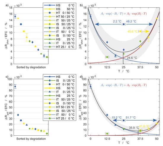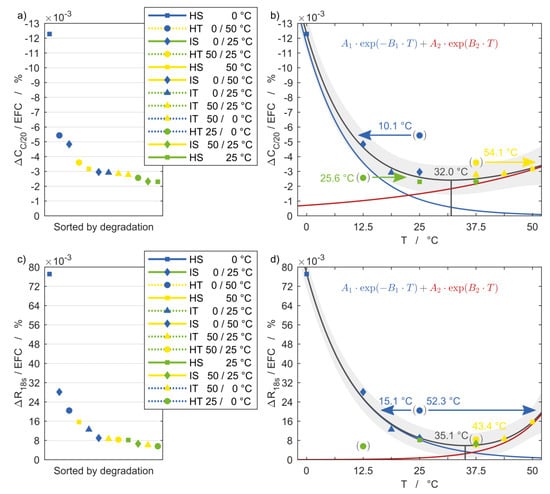 To quantify and relate the degradation to temperature, the following graphs refer the aging quantities to the number of EFC. It is important to consider that for this reason only the final values are decisive and the shape of the curve is disregarded. Figure 7 and Figure 8 show on the left side the aging rate of the respective quantity for each setup, sorted by the degree of degradation. On the right side the temperature dependence is shown using the same vertical axis. The temperatures of the horizontal axis represent the EAT following Equation (3). The superimposed exponential functions given by Equation (5) are colored blue and red and together result in the black curve with the 95% confidence intervals in grey.