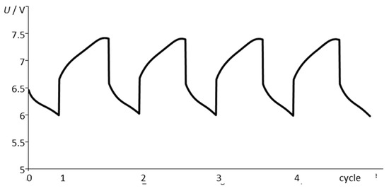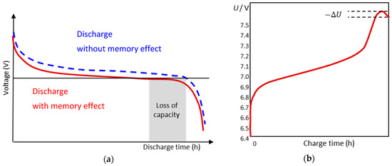 The memory effect [21] or lazy battery effect is a special type of aging phenomenon with rechargeable nickel–cadmium (NiCd) chemistry that causes the battery to hold less charge (Figure 1). The battery gradually loses its maximum energy capacity when it is repeatedly recharged after being only partially discharged [22]. The battery seems to remember the previous state of charge, and causes an undesired early voltage drop when charged again. Due to crystal formation at the anode, the stored energy becomes available only at a lower voltage than before. Unfortunately, the memory effect is exceedingly difficult to reproduce in model experiments. In modern NiCd batteries, the resulting loss of capacity is partly compensated by a discharge reserve. The memory effect can be repaired by a complete charge–discharge cycle, which recovers the original capacity (except for calendar and cycle aging).
