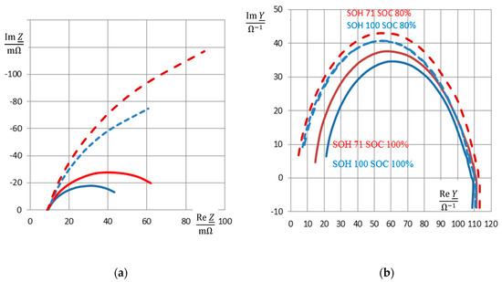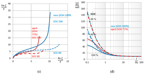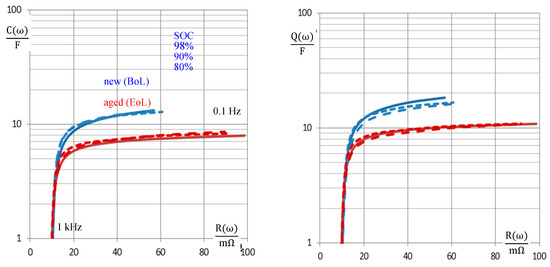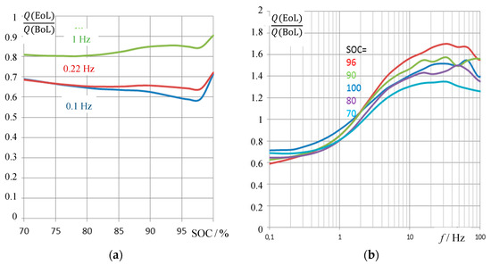 It becomes obvious that the impedance-based pseudo-charge correlates both with the actual Ah-based state-of-charge SOC between 70% and 96%. The fully charged battery (SOC = 100%) creates an outlier, because of the overcharge phenomenon that distorts the impedance-based capacitance measurement by parasitic electrochemical reactions. As an alternative to Figure 7, the relative loss of charge between new and old batteries can be drawn (i.e., ((Q(EoL) − Q(BoL))/Q(BoL)), which shows the same trend in the reverse direction. Useful frequencies for practical SOH determination lie below 1 Hz or below 100 Hz whether or not the internal resistance of the battery is considered as a proper aging criterion with calculating the pseudo-capacitance, C(ω) = Re C, according to Equation (5). Above 500 Hz, the spiral roll of the cell generates inductive impedance values, which are not useful for state-of-charge determination.