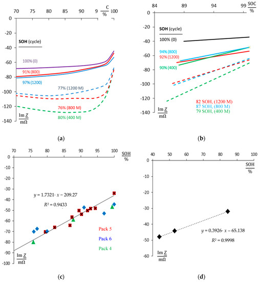 Figure 5a compiles the reactance at 1 Hz versus the real state-of-charge, which was defined by ampere-hour counting. During aging, reactance drops due to the loss of available capacity (100% to 80% SOH). At the 800th cycle, 76% SOH is reached. The memory effect is eliminated by a single deep-discharge and the successive full charge. Indeed, capacity improves again to 91% SOH. After 1200 cycles, 97% SOH is restored and 77% SOH without removal of the memory effect.