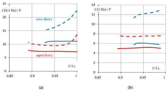 Pseudo-capacitance C(ω) at different frequencies was investigated at different cells between beginning of life (BoL) and end of life (EoL, SOH = 71%) at state-of-charge values between 70% and 100%. In Figure 6, capacitance displays the state-of-health for the charged batteries between the rated voltage U0 and 0.9 U0. Pseudo-capacitance at 0.1 Hz shows the difference in the SOH of new and aged batteries more clearly than the measurement at 0.1 Hz. C calculated by Equation (4) contains the internal resistance of the battery, whereas the approximation CD requires a higher frequency to give a reliable correlation with SOH.