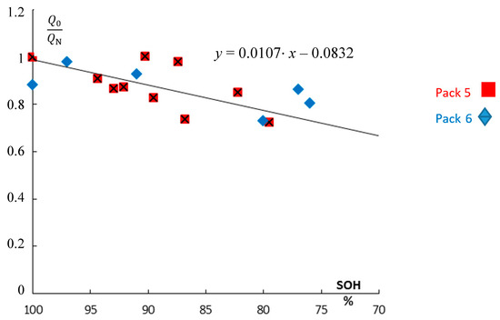 The impact of aging. Ratio of the available electric pseudo-charge Q0(t) of used NiCd batteries with respect to the rated value of the new battery QN (pack #5 and pack #6). Data are taken from Figure 5. Impedance-based pseudo-charge Q0 = C(1 Hz) U (divided by the rated capacity QN) correlates well with the true SOH values from Ah measurements.