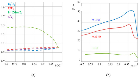 Aging characteristics of a NiCd battery (cell #5 of pack #6). (a) Different normalized state-of-charge quantities with respect to voltage U/U0, pseudo-capacitance C/C0 at 0.22 Hz, imaginary part of impedance at 0.22 Hz, and relative time constant τ/τ0 at 0.22 Hz against the actual state-of-charge received from Ah counting. (b) Relative time constant between the old battery τ = R(1 kHz)⋅C(0.1 Hz) and the new battery τ0 at different frequencies according to Equation (6).