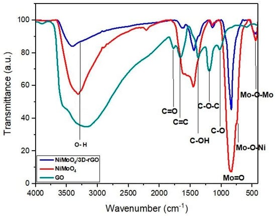 Fourier transform infrared spectrometry (FTIR) spectra of the graphene oxide (GO) sheets, NiMoO4 nanoparticles (NPs), and NiMoO4/3D-rGO nanocomposite.