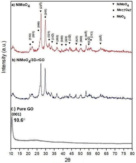 X-ray powder diffraction analysis was performed to investigate the structure of the synthesized powders. In Figure 2, the XRD patterns of the NiMoO4 NPs, NiMoO4/3D-rGO nanocomposite, and pristine GO is illustrated. Diffraction peaks of the NiMoO4 NPs in Figure 2a match with the code number of 00-045-0142. It should be noted that the peaks at around 27.3°, 30.36°, and 45° were attributed to α-NiMoO4 []. During the process, Ni2+ and MoO42− cations reacted with OH− to form a Ni–Mo hydroxide precursor, as shown in the following equations []:
