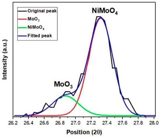 In addition, the XRD pattern of the NiMoO4 powder revealed an asymmetric peak at 2θ = 27.3°. For a more accurate study, this peak was opened. As shown in Figure 3, after deconvolution of the asymmetric peak, it was divided into two distinct peaks, at 2θ = 26.86° and 2θ = 27.31°. These peaks were respectively attributed to MoO3 (040) and α-NiMoO4 (221−) phases. The MoO3 phase was produced from a combination of Mo6+ ions and oxygen.