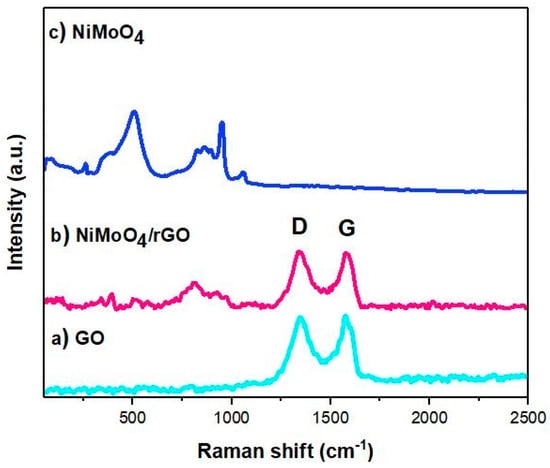 The Raman spectra of GO, NiMoO4 NPs, and NiMoO4/3D-rGO nanocomposites (Figure 4) were analyzed to check whether GO was reduced during the synthesis. It was established from Figure 4a that GO had two characteristic peaks: the D bond at 1347 cm−1 originated from the defects in the hexagonal graphitic network and the G bond at 1584 cm−1 was due to the vibration of the sp2 domain of carbon atoms []. Comparison of the Raman spectra of NiMoO4/3D-rGO nanocomposite (Figure 4b) with GO spectra exhibited a shift in the D (1383.87 cm−1) and G (1580.56 cm−1) positions. The intensity ratio of the D and G peaks (ID/IG) reveals the degree of the disorders. By reduction of graphene oxide and removal of oxygen groups, the defects increased and the ID/IG ratio showed an increase from 0.98 to 1.02. This was attributed to the increase of the defects in rGO [,,]. The intensive peak at 969 cm−1, and some slight intensity peaks at 928, 825, 394, and 325 cm−1 denoted the stoichiometric α-phase NiMoO4 (Figure 4b,c) [,,]. The peaks at 969 and 928 cm−1 were related to the symmetric and asymmetric stretching modes of the Mo=O bond, whereas the peak at 825 cm−1 occurred due to the Ni–O–Mo symmetric stretch. The peaks at 394 cm−1 and 325 cm−1 were representative of the bending band of Mo–O and Mo–O–O [,,]. The Raman results confirmed the reduction of GO to rGO in the NiMoO4/3D-rGO nanocomposite. Thus, by increasing the defects in rGO, more active sites can be provided for enhancing the electron storage and improvement of capacity [].