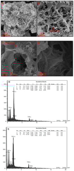 Scanning electron microscopy (SEM) images of (a,b) NiMoO4 NPs with two different magnifications, (c,d) NiMoO4/3D-rGO nanocomposite with various magnifications, (e) corresponding EDX spectra of NiMoO4/3D-rGO, and (f) corresponding EDX spectra of NiMoO4.