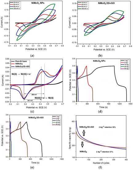 Mo is not involved in redox reactions. This element, with a high conductivity, can increase the whole capacity of the cell [,]. As shown in Figure 6b, the CV curves of the NiMoO4/3D-rGO electrode, similar to the NiMoO4 electrode (Figure 6a), at low scan rates displayed two redox peaks related to NiMoO4 faradaic reactions (Ni2+/Ni3+). The NiMoO4/3D-rGO hybrid electrode consisted of two mechanisms for storing energy: the faradaic reaction of NiMoO4 as well as the formation of an electric double-layer because of the presence of the graphene oxide sheets in the composite. This can lead to the storage of more electrons in the NiMoO4/3D-rGO in comparison to NiMoO4. According to Equation (1), the maximum capacity for a NiMoO4/3D-rGO electrode is 249.8 Cg−1 (356.4 Fg−1) at a scan rate of 10 mVs−1 and at the scan rates of 20, 50, and 100 mVs−1, it was calculated to be equal to 212.8 Cg−1 (304 Fg−1), 152.95 Cg−1 (218.5 Fg−1), and 84 Cg−1 (120 Fg−1), respectively, whereas the calculated capacity for NiMoO4 at the scan rates of 10, 20, 50, and 100 mVs−1 is 211.2 Cg−1 (301.7 Fg−1), 192.85 Cg−1 (275.5 Fg−1), 126.84 Cg−1 (181.2 Fg−1), and 67.69 Cg−1 (96.7 Fg−1). This shows that the introduction of rGO to NiMoO4 increased the capacity. Figure 6c illustrates the CV curves of Ni foam, NiMoO4 NPs, and the NiMoO4/3D-rGO nanocomposite. As can be seen, the CV curve of the NiMoO4/3D-rGO nanocomposite had a slightly larger enclosed area at the scan rate of 10 mV·s−1, reflecting that the NiMoO4/3D-rGO hybrid nanocomposite electrode has higher specific capacity and the Ni foam capacity can be neglected. More capacity of NiMoO4/3D-rGO confirms that oxygenated functional groups of GO were removed and more conductivity provided, resulting in more capacity. In addition, the differences between the reduction and oxidation potentials for the NiMoO4/3D-rGO and NiMoO4 electrodes were 241 mV and 280 mV, respectively. Thnis reveals an improvement in the electrochemical reversibility of the NiMoO4/3D-rGO electrode due to the addition of rGO sheets to NiMoO4 NPs.