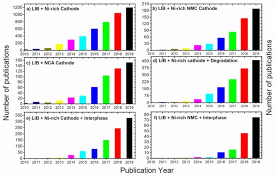 Ni-rich layered cathodes have been materialized as next generation materials because of their relatively high discharge capacity (i.e., 180–230 mAh g−1), lower overall cost, and so forth in the search for high-performance devices. Recently, the research interest in Ni-rich cathodes has been exponentially augmented (Figure 1a,b), once again proving the huge attention that is given by the academia, governments and industries. However, Ni-rich cathode materials are beset with detrimental challenges, hindering their large-scale integration into the evolving xEVs market.