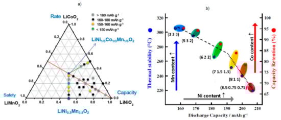 (a) Compositional phase diagrams of lithium stoichiometric-layered transition-metal oxide: LiCoO2-LiNiO2-LiMnO2. The positions indicated by dots represent the described LiNi1−x−yCoxMnyO2, reproduced from Ref. [21] with permission, Copyright 2015, John Wiley and Sons; (b) Sketch on the effect of transition metals on discharge capacity (black), thermal stability (blue) and capacity retention (red) of Li[NixCoyMnz]O2 compounds with number in brackets corresponding to the composition (Ni, Mn, Co). The positive effect of Ni on capacity, Mn on thermal stability and Co on capacity retention and rate performances is underlined. Reproduced with permission from Ref. [22], Copyright 2015, Electrochemical Society.