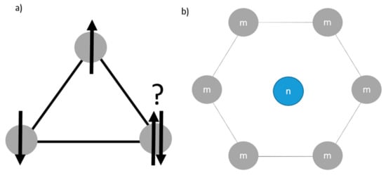 (a) Illustration of geometrical frustration where three ions with magnetic moments are arranged in trigonal planar, the sum of all moments cannot equal zero. (b) Rearrangement of ions within NMC to release geometric frustration, ions: m (grey) with magnetic moment, i.e., manganese and nickel form a hexagon with a non-magnetic, ion n (blue), i.e., cobalt or lithium, in its center.