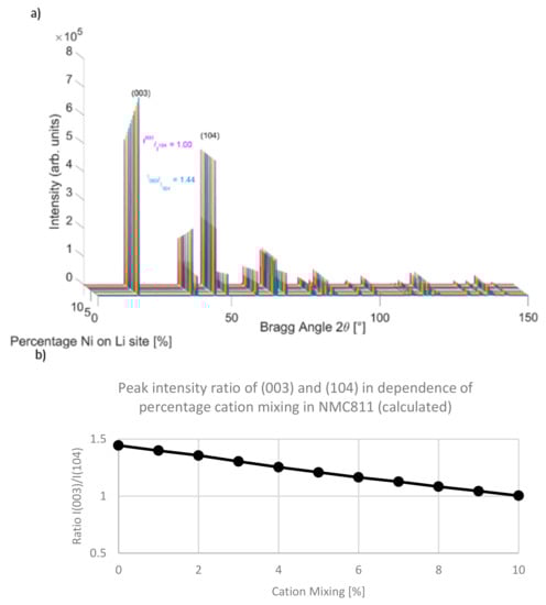 One of the possibilities for identifying and quantifying cation mixing is the utilization of X-ray diffraction (XRD), i.e., from the dependency of the ratio of the intensities of the (003) and (104) peaks on the amount of antisite Ni and Li. Patterns that were calculated using the WinPlotr tool of the FullProf Suite [50] show that, in low cation mixing (Figure 5a), the ratio of the peaks is 1.2, however, as the amount of cation mixing increases, the ratio I003/I104 is decreased (Figure 5b).