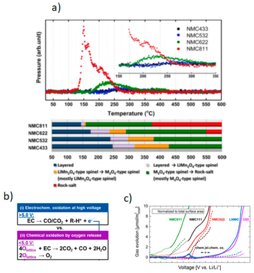 The commercialization of Ni-rich cathode materials austerely needs the full-scale appraisal of their safety-induced risks. It has been proven that the thermal stability of NMC decreases with increasing its Ni content, i.e., against increasing capacity and decreasing material cost [51]. From Figure 6a, it is clear that increasing the Ni content results in decreasing the onset decomposition temperature and increasing the strength of the exothermic peak (i.e., degree of heat release as can be evaluated by the enthalpy, ΔH) as well as pressure. This is attributed to the lower binding energy of Ni3+-O bond and, thus, oxygen get released during calcination from the layered lithium transition metal oxide structure, which leads towards shifting in the ratio between Ni2+ and Ni3+ and introduction of oxygen defects into the lattice favoring cation mixing. Figure 6b,c give the decomposition of the predominant electrolyte solvent (ethylene carbonate, EC) and liability towards gas evolution of alkyl carbonates in the presence of different electrode materials. It is attributed to the oxidation of the alkyl carbonates by the reactive oxygen that is released from the NMC lattice. The gassing kinetics of alkyl carbonate-based electrolytes on various cathode electrodes and conductive carbon (C65) shows that the onset potential for the evolution of gases (e.g., CO2 and CO) heavily depends on the nature of the electrode materials and increases in the order of NMC811 < NMC111 ~ NMC622 < C65 ~ LNMO (Figure 6b,c) [52]. The difference in the gas evolution on NMC811 vs. the other NMC versions (i.e., NMC111 and NMC622) can be explained due to an increase in the portion of the highly reactive Ni3+/Ni4+ in the total amount of Ni with increasing the nickel content (≥ 80%). This again reaffirms that a due care and in-depth investigation with respect to the thermal stability is needed for the commercialization of Ni rich (with Ni ≥ 80%) cathode materials.