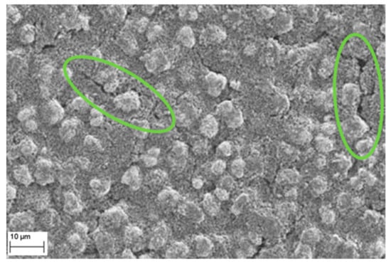SEM image of cathode with cracks within binder structure but unimpaired cathode particles.