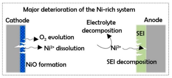 Ageing leads to capacity and power fading in LIBs and it results from degradation phenomena. On a material level, it is mainly attributed to the loss of lithium inventory and that of active materials either on the anode or cathode compartments [67,68]. Such changes can occur in calendrical, i.e., time dependent, or cyclic, i.e., dependent on the amount of transferred charges. Various studies have evidenced that particle cracking and phase transformation are the degradation mechanisms for many of the NMC compositions, including NMC111 [69], NMC442 [70], NMC532 [71], and NMC811 [72]. In general, Ni-rich NMC face serious degradation at higher upper cut-off voltage and elevated temperatures [73,74]. Figure 8 summarizes the main performance deterioration routes, enlisting electrolyte decomposition, O2 evolution, Ni2+ migration to the anode and precipitation, CEI dissolution, SEI contamination, and so forth in Ni-rich cathode materials [75].