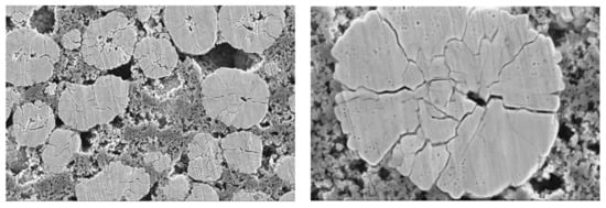 In the case of the lattice parameter c, representing the distance of the transition metal layers to each other, the situation is more complex. At first, the unit cell expands in c-direction as lithium is extracted due to an increased electrostatic repulsion between the oxygen atoms. As charging continues, a shrinkage of c occurs. In NMC, there is a formation of a hybrid orbital consisting of transition metals with their characteristic d orbital and the oxygen p orbital. At higher degrees of delithiation, charge compensation is not solely provided by transition metal ions, but also by the hybrid orbitals, which leads to a charge transfer from the oxygen 2p orbital towards the partially filled nickel eg orbital. Consequently, the repulsion between oxygen atoms decreases and the parameter c shrinks due to the increase in the covalency between the metal and oxygen, and, in this case, the NMC becomes more reactive, being associated to the release of highly reactive oxygen (e.g., singlet or atomic oxygen) from the NMC lattice [80]. This ultimately leads to further accelerated degradation phenomena. At first, the volume change induces stress in the secondary particles, leading to cracks between the primary particles, i.e., intergranular cracking (Figure 9) [81,82]. As a consequence, capacity fading occurs, which is linked to the detachment of primary particles from the secondary particle matrix [83]. Here, the resistivity of detached particles increases drastically and, in an extreme case, it is present as inert phase [84]. A recent investigation of NCA particles by Besli et al. [85] proved such correlation and the authors showed that a local increase of impedance and the rearrangement of the diffusion paths is a result of intergranular cracking within the NCA particle [85]. Furthermore, there is a correlation between the particle size distribution of NMC particles and state of health, which indicates that degradation is a result of particle cracking [57,86].