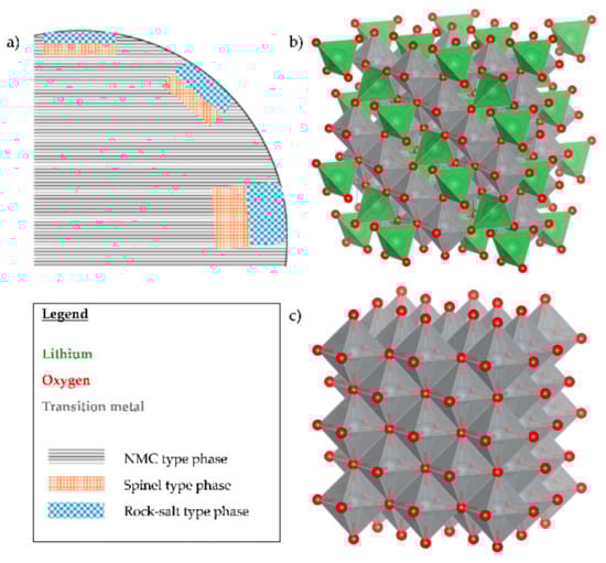 (a) Scheme of cross-sectional view in NMC particle revealing R-3m structure (layered) and exemplary regions of structural distortion, size of these sections is anisotropic, larger in direction of Li diffusion paths, orange section representing spinel type phase, blue section representing rock-salt type phase. (b) Fd-3m spinel type structure with Li (green) in tetrahedral coordination with oxygen (red) and transition metal (grey), mostly nickel in octahedral coordination representing first full phase transformation from layered structure towards distorted structures. (c) Fm-3m rock-salt structure with octahedral coordination of transition metal (grey), mostly nickel, with oxygen (red), structure is fully delithiated without Li ion conductivity. Structural models are plotted with VESTA.