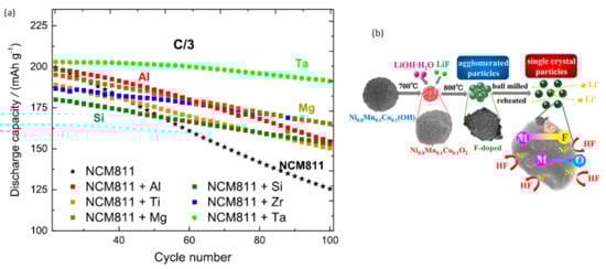 Overlithiation, which was presented earlier as an approach for reducing initial cation mixing during synthesis, can be considered as cation doping of the transition metal layer [114]. In this case, the resulting structure is comparable to Li-rich NMC, where Li is inserted into the transition metal layer of the layered R-3m structure. The beneficial features of this approach is the increase in capacity, albeit poor cycle life and fast capacity fading [115]. However, Wang et al. showed that there is an optimum limit for overlithiation of Ni-rich layered oxide cathodes, because, beyond this point, the performance of the material is diminished [116]. Another route of improving the material characteristic is the partial substitution of the transition metals. In this regard, Co came into focus due to its high toxicity and costs or Mn due to its electrochemical inactivity [117]. The substitution of Ni is insensible, since it provides most of the capacity to the battery cell. The choice of the dopant is attributed to the bond energy of the substituting element with oxygen, since high bonding energy is associated with improved structural stability [118]. In general, due to their electronic configuration, i.e., d-electrons, transition metals are capable of contributing to the capacity. For example, iron doped LiNi0.35Mn0.35Co0.27Fe0.03O2 deliver a higher capacity when compared to its iron free counterpart [119]. In case of doping with non-transition metal elements, the capacity of the cathode active material is lowered. Figure 12a shows significant improvement upon doping of Ni-rich NMC811 cathode with various cation dopants [120]. Among tested cations, tantalum (Ta5+) is found to be the most effective dopant, improving the discharge capacity, capacity retention, and cycling stability at 45 °C.