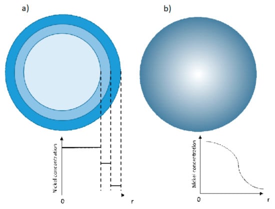 In general, increasing the Ni content will increase the capacity and decrease the cost, but, at the same time, decreases the structural and thermal stabilities. In view of the latter, core-shell (Figure 13a) and full concentration gradient (Figure 13b), which are also more exemplified in Figure 13c, have been proposed as enabling solutions to address the degradation phenomenon in Ni-rich cathode materials [31,122]. Hereby, a core-shell should not be confused with surface coating. For the latter, a thin, non-isostructural film (in range of Angstrom or nanometer) is coated onto the Ni-rich cathode particles, whereas a thicker, isostructural, Li-ion conductive film is applied in the case of core-shell [19].