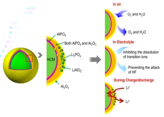 Possible mechanism of double-coated NMC cathode material, using Al2O3 and AlPO4. Reproduced from Ref. [130] with permission, Copyright 2017, Elsevier.