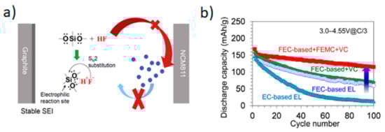 The use of electrolyte additives presents to be the most efficient and economic means towards solving the multifaceted hurdles that are associated with nickel rich cathode materials [75]. The additives, which are incorporated in small doses, can play multiple roles, including as cation stabilizers, reactive oxygen radicals and HF scavengers, robust cathode-electrolyte interphase (CEI) builders, surface modifiers, etc., without altering the bulk properties of the electrolyte system. Among many others, fluorinated molecules, such as Methyl (2, 2, 2-Trifluoroethyl) carbonate (FEMC) [132], bi-lithium difluoro(oxalato)borate, pentafluorophenylisocyanate, Lithium difluoro (oxalate) borate (LiDFOB) [133], lithium difluorophosphate (Li2PO2F2), tris(2,2,2,-trifluoroethyl) phosphite (TTFP) [134], triphenylphosphine oxide boron trifluorid (TPPO-BF) [135], and other functional groups, such as bi-functional tris(trimethylsilyl) phosphate, (2-cyanoethyl) triethoxysilane, etc., are among the investigated additives and they proved to prevent transition metal dissolution and/or oxygen leaching owing to the formation of effective passivation layers both on the anode and cathode surfaces. Some additives with strong anion coordination effect, for instance tris (pentafluorophenyl) borane (TPFPB), are known to trap highly reactive oxygen species (O22-/O2-) or radicals (O2Ÿ-/OŸ-) that will otherwise oxidize the electrolyte and induce structural transformation [136]. Figure 15a,b show the enabling effect of sample additives (i.e., silyl-functionalized dimethoxydimethylsilane and blend of FEMC and VC) on Ni-rich cathode materials [137,138].