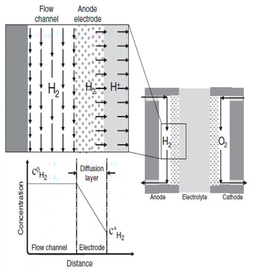 At this time, the net current density can be expressed according to the diffusion of reactive gas in the anode electrode [32,33,34,35]: