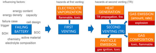 In literature several important hazards from failing state-of-the-art batteries are reported resulting in main five hazards, which may lead to safety and health risks (Figure 1): electrolyte vaporization, heat generation, gas emission, gas concentration and particle emission. Hazards based on high voltage and current are not considered in this study. The first venting and the TR of the cell can cause the following hazards: