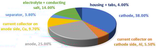The mass split of the discharged cell presented in Figure 2 is estimated based on the investigations of the cell material and considers the cell design and data from literature for NMC cells [,]. The mass of SEI, binder and carbon black are omitted. It is assumed that 14% of the initial mass of the cell is electrolyte and conducting salt. This corresponds to 121.5 g of electrolyte, consisting of 44 g of EC, 59 g of DEC, 3.7 g of DMC and 14.8 g of LiPF6.
