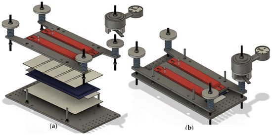 Cell sample holder (a) open and (b) closed; two heater stripes (red) on the top and two on the bottom side of the stainless-steel plates (dark gray), thermal insolating mica sheets (beige) between the cell (symbolic geometry and design of a pouch cell (blue)) and the stainless-steel plates, thermocouples attached on the mica sheets facing the cell surface.