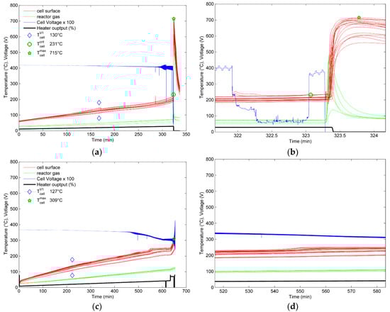 - Starting at about 160 °C the exothermic process inside the cell accelerates the self-heating and results in a TR. The TR is accompanied by violent gas and particle release (second venting). Electrolyte decomposes exothermally [,] between 200–300 °C []. At the TR, the cell temperature increases enormously due to chemical reactions inside the cell. Metal oxide cathodes decompose and produce oxygen (O2) [,]. O2 further reacts with electrolyte and produces CO2 and H2O [,].