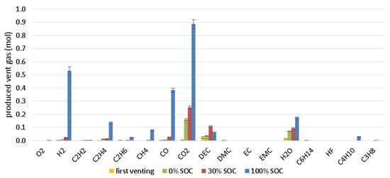 Main gas compounds at TR are carbon dioxide (CO2), carbon monoxide (CO), hydrogen (H2) and hydrocarbons [,]. The produced gas is toxic and flammable [,]. Except for CO2 and H2O all produced gases are flammable, explosive and deflagration of the produced vent gas in contact with O2 is possible. In addition, small amounts of toxic gases like hydrogen fluoride (HF) can be produced by decomposition of fluorine compounds as LiPF6 [,].