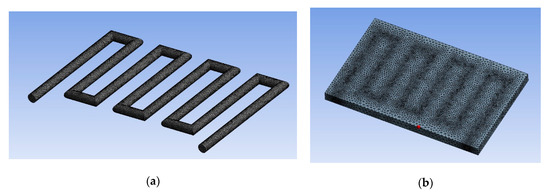 With the intention of analyzing the thermal performance of the battery cell, while the battery charges and discharged at different current rates, a steady heat flux (W/m2) was exerted via the surface of the cooling plate. The meshing design of the cold plate is illustrated in Figure 2. The tetrahedron mesh grid was adopted.