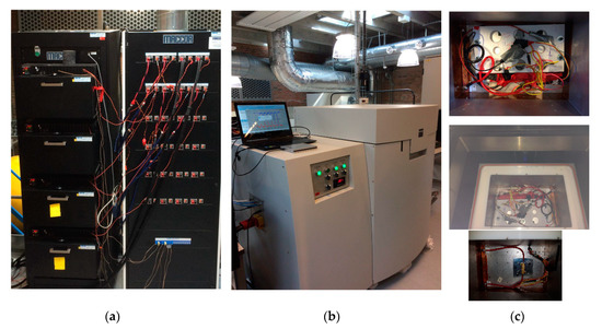 Experimental facilities. (a) Maccor automated test system; (b) Isothermal battery calorimeter; (c) Battery and resistance inside the calorimeter.