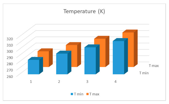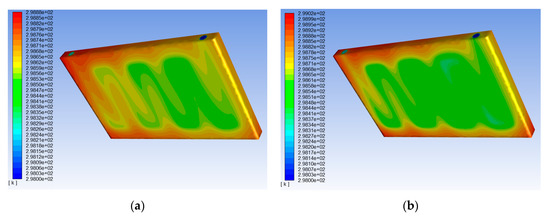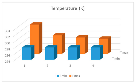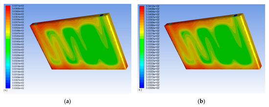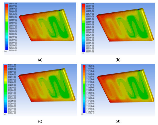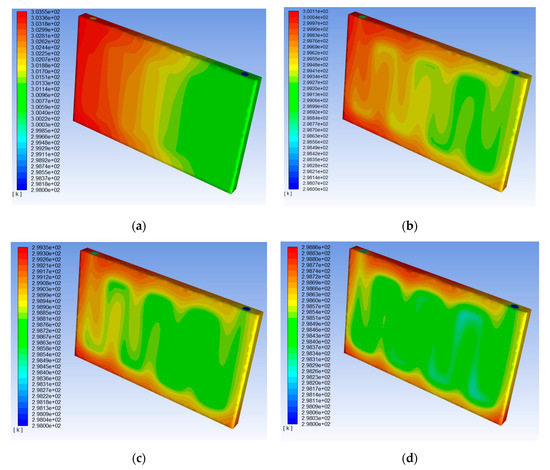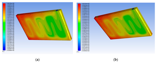 It can be seen that the temperature is lower in the vicinity of the inlet zone. Notwithstanding, it becomes greater at the exit area for every configuration. This circumstance could be expressed in such a way that the coolant fluid receives heat throughout the streaming process in the conduit; therefore, the temperature rises alongside the outlet orientation. While the entrance temperature rises, the amount of temperature change demonstrates a negligible variation between different cases. Maximum and minimum temperatures of the cooling plate, for this case, are illustrated in Figure 7.