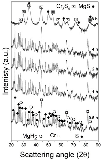 The use of magnesium hydride instead of magnesium was experimented because of the higher reactivity of the former and for its capability to react with S and Cr under mechanochemical stimulation. For example, Goo and Hirscher [27] obtained MgS by high energy ball milling, starting from MgH2 and S. In other works, the use of MgH2 with Cr resulted in a ternary Mg-H-Cr phase [28].