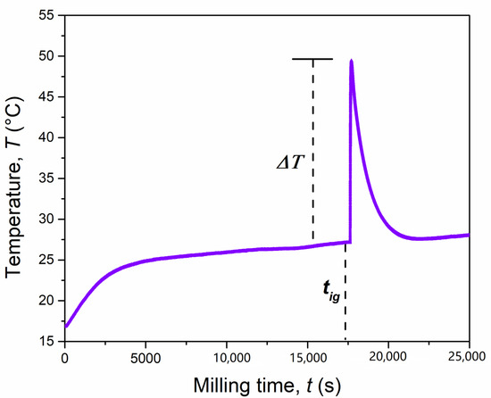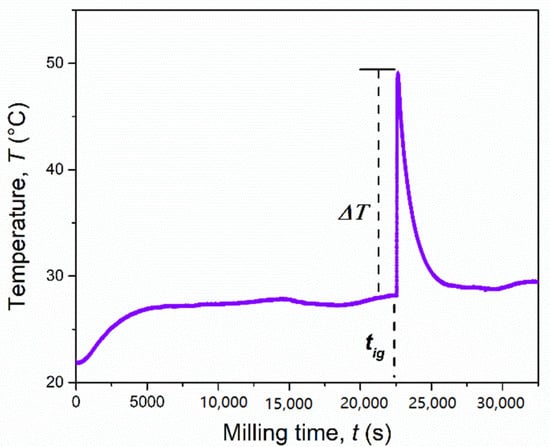 During the synthesis, the external temperature of the mechanochemical reactor increased significantly. This, in combination with the instantaneous conversion of reagents, is often an indication of a mechanically induced self-sustaining reaction (MSR) process [29], as sometimes observed when metal chalcogenides are synthesized from their corresponding elements [30]. To verify this aspect, the temperature of the reaction vial was monitored over time, under the same specific mechanochemical conditions. The recorded temperature profile is shown in Figure 2, and it consists of three main steps, as usually observed for a mechanically-induced MSR process. In the first step, known as induction or activation period, the particles and/or crystallites are subjected to size reduction reaching a critical limit after 290 min (17,400 s). This was proven by XRD, in particular for MgH2. The temperature increase observed during this step (+10 °C), was principally due to the heat dissipation through the walls of the vial. The second step, corresponding to an abrupt increase of the temperature up to 49 °C (ΔT = 23 °C in few seconds), is referred to as the ignition time and it is the consequence of the combustion front propagating through the powders charged. In the final step, the temperature decreases rapidly to a value similar to that before the ignition event. During this step, the evolution of the product structure takes place. In order to further investigate this reaction, the solid obtained just after the ignition time, after 5 h (18,000 s) of BM, was inspected by scanning electron microscopy (Figure 3) and XRD (Figure 4).
