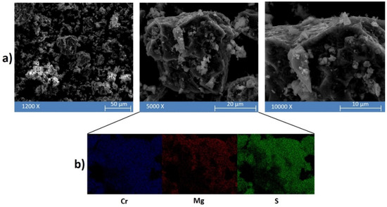 At low magnification (12,000 X—Figure 3a left panel) it is possible to observe that the plastic deformation and agglomeration of the particles are predominant. The powders were actually characterized by agglomerates of around 40–60 μm, as usually observed after MSR [31]. Furthermore, the presence of irregular cavities observed at high magnification (5000 X—Figure 3a central panel) can be ascribed to self-propagating high-temperature reactions. The elemental composition of a representative agglomerate was characterized by EDS (Figure 3b): three main elements were detected—viz. Mg, Cr, and S—which were homogenously distributed on the agglomerate, suggesting a quite uniform composition of the solid mixture formed upon ignition. However, a higher concentration of Mg is localized in the small particles of 2–0.5 μm detected on the surface of the agglomerates, as shown in the right panel of Figure 3.