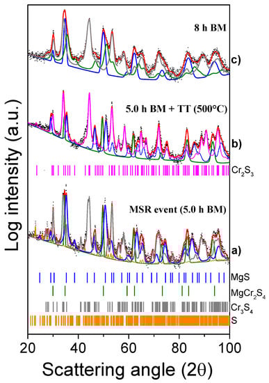 Finally, the XRD pattern of the system milled for 8 h (28,800 s) (Figure 4c), was properly interpolated with MgS (33 wt%), Cr3S4 (52 wt%) and the thiospinel MgCr2S4 (15 wt%) phases. It is also important to highlight that all peaks broadened and decreased in intensity, while an increase of the whole pattern background was observed. A significant reduction of the crystallite size was estimated for all the phases (MgS = 811 Å, Cr3S4 = 513 Å, and MgCr2S4 = 80 Å). This indicates that for longer milling times, the thiospinel phase can gradually turn into a mixture of nanocrystalline and amorphous phases, and, for this reason, its relative amount might be underestimated. However, even though MgCr2S4 is supposed to be one of the thermodynamically favored products (Table 1), the possibility that it decomposes into other Mg- and Cr- sulfides during prolonged BM cannot be disregarded.