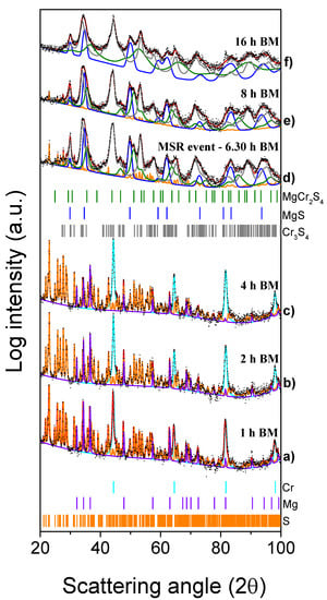 XRD patterns of the Mg + 2Cr + 4S system mixture subjected to the mechanical treatment for the times indicated (1 to 16 h from (a–f).