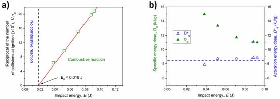 (a) The reciprocal number of collisions at ignition time as a function of the impact energy (green empty squares). The best linear fit is reported as a red line. (b) The specific energy dose (green full triangles) and the activation energy dose (blue empty triangles) as a function of the impact energy.