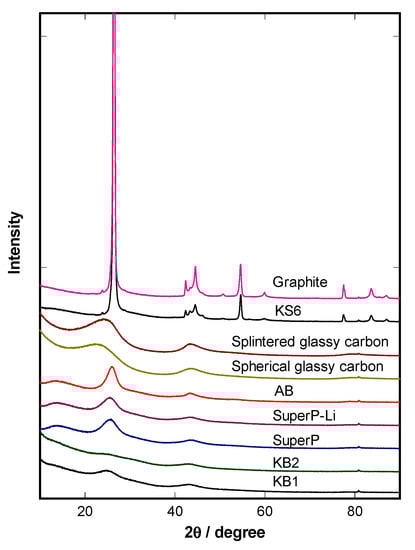 Nine types of carbon were used in the stability test. Figure 1 represents the XRD patterns of all carbon materials. The XRD patterns of the carbon graphite and the KS-6 can be indexed to the hexagonal P 63 mc structure [26]; there are two XRD peaks at 43.60° and 46.4°, which do not reflect the P 63 mc structure and they may be attributed to the rhombohedral R-3 m structure of carbon [27]. The layered structures of the graphite and KS-6 are further observed on SEM (Figure 2h,k). The broad peak at 26 two-theta degree on the XRD pattern of acetylene black is responsible for the (002) plan of the graphitic structure [28]. This feature is also observed on SuperP-Li, SuperP, and Ketjen Black 1 types. The XRD pattern of the Ketjen Black 2 does not show any distinctive peak, thus this material is completely amorphous. The (002) peaks of the Splintered Glassy Carbon and the Spherical Glassy Carbon are shifted to the left at different degrees, reflecting higher (002) lattice spacing compared with that of the other carbon materials. Glassy carbon materials are different from the rest as they inherit the structure of fullerene [29].