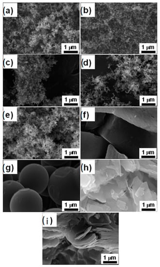 SEM images of (a) AB, (b) KB1, (c) KB2, (d) SuperP, (e) SuperP-Li, (f) splintered glassy carbon, (g) spherical glassy carbon, (h) KS6, and (i) graphite. Magnification: ×20,000.