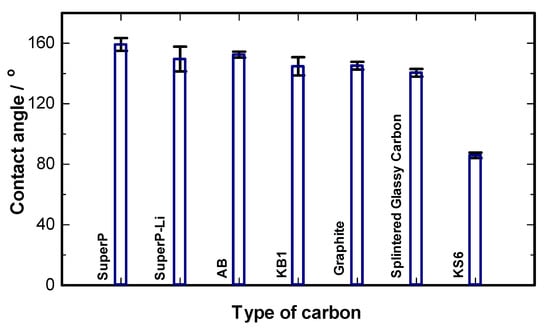 Pure carbon materials should be hydrophobic in nature. All carbons studied in this work exhibit high contact angles, except carbon KS-6. KS-6 is graphitic with a high surface area and contains thin flakes vs. the surface texture of graphite. In a study by Parobek and Liu, thinner flakes and graphene-like materials exhibit lower contact angles [35]. When increasing the number of graphene layers, the contact angle increases and approaches the contact angle of graphite. Additionally, the higher surface area may provide a little more adsorption of water through the slit-type openings. In general, this is good for aqueous batteries because the surface of the prepared cathodes can be more hydrophilic and have better interfacial contact with aqueous electrolytes. Many of our projects related to aqueous batteries use carbon KS-6 in the formulation of cathodes.
