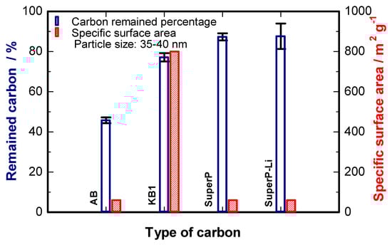 Figure 5 shows the remaining carbon percentage of cathodes using different types of carbon after the stability test. The standard deviation of the result of cathodes containing spherical glassy carbon is larger than the others. This value comes from the non-uniform carbon distribution in the cathode composite. Thus, the stability measurement of spherical glassy carbon is unreliable and should be removed from consideration. Among the characterized carbon materials, graphite is the most stable one: after the stability test, 96.4 wt% of graphite carbon remains. This is correlated with the previous results in Figure 4 that the graphite-containing cathode exhibits high initial resistance to overcharging. On the other hand, acetylene black is the least stable carbon, with a loss of up to 54.2 wt%. The self-discharge period has no significant effect on the carbon loss because carbon contents measured before and after self-discharge are similar. It is concluded that most carbon loss happens in the over-charge process, which has significantly higher current density and potential than those of the self-discharge one. Figure 6 presents the remaining carbon percentages of four types of carbon materials, which have similar particle shapes and particle sizes of ~35–40 nm: KB1, AB, superP, and superP-Li. The specific surface area of AB (~60 m2 g−1), SuperP, and SuperP-Li are at the same magnitude, and they are much smaller than that of KB1 (~800 m2 g−1). However, AB is less stable than KB1, while superP and superP-Li are more stable.
