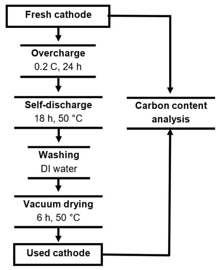 The flow chart of the carbon stability test is shown in Figure 1. Each cathode was prepared by casting the slurry containing commercial LiMn2O4 (MTI), carbon, and polyvinylidene fluoride (PVdF, Kynar®, HSV900) (80:15:5 wt%) in 1-methyl-2-pyrrolidinone (NMP, Sigma-Aldrich, St. Louis, MO, USA, ≥99.5% purity) on a conductive polyethylene (PE, All-Spec Industries, Wilmington, DE, USA) film, followed by vacuum drying at 50 °C for 12 h. Disks of 12 mm in diameter were cut (typical active material loading of 6.6 mg cm−2) and soaked in the electrolyte solution under vacuum for 30 min. Zinc disks 12 mm in diameter (Rotometals, ~99.6% purity, titanium added) were polished by 1-micron polish powder (Buehler), washed by deionized water, and then, used as anodes. The electrolyte was prepared by dissolving 1 M ZnSO4.7H2O (Alfa Aesar, Tewksbury, MA, USA, ≥98% purity) and 2 M Li2SO4 (Sigma-Aldrich, ≥98% purity) in deionized water and pH was adjusted to 4.00 ± 0.05 using 0.1 M H2SO4 solution or LiOH solution. An absorbed glass mat (AGM, NSG Corporation, Tokyo, Japan) was used as the separator. The carbon stability test was conducted using two-electrode Swagelok-type cells. The cells were charged galvanostatically on a multichannel battery tester (BTS-5V5mA, Neware, Shenzhen, China) at 0.2 C (1 C = 130 mA g−1) for 24 h, and then, kept in an oven at 50 °C for 18 h. Applied currents and specific capacities were calculated based on the weight of LiMn2O4 in the cathode. Oxygen evolution will occur at the overcharge stage [6,7] because the applied potential is higher than the potential required for oxygen revolution, which leads to the oxidation of the carbon conductor.